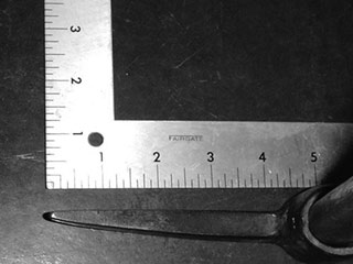 Pickaxe pointed end is 1/2" wide at the base and 1/8" wide at the point.